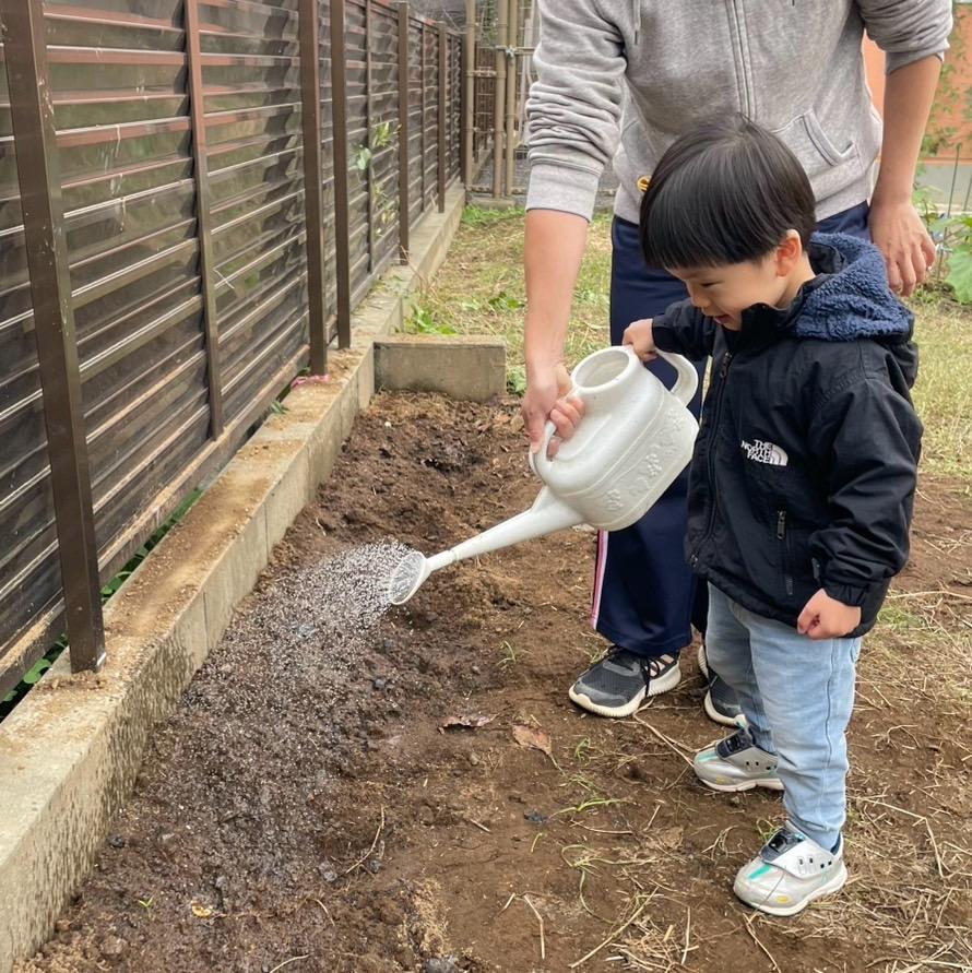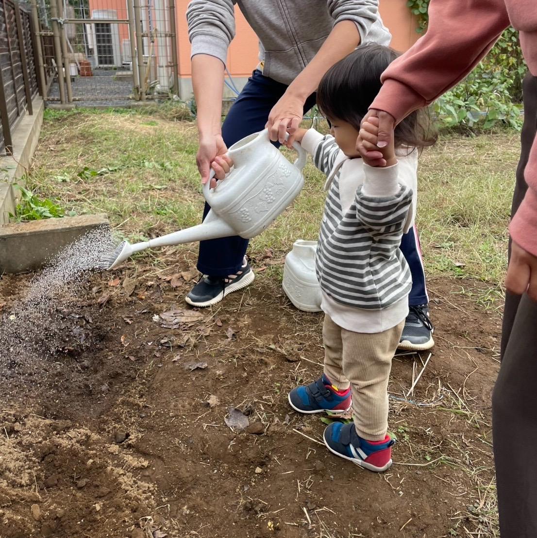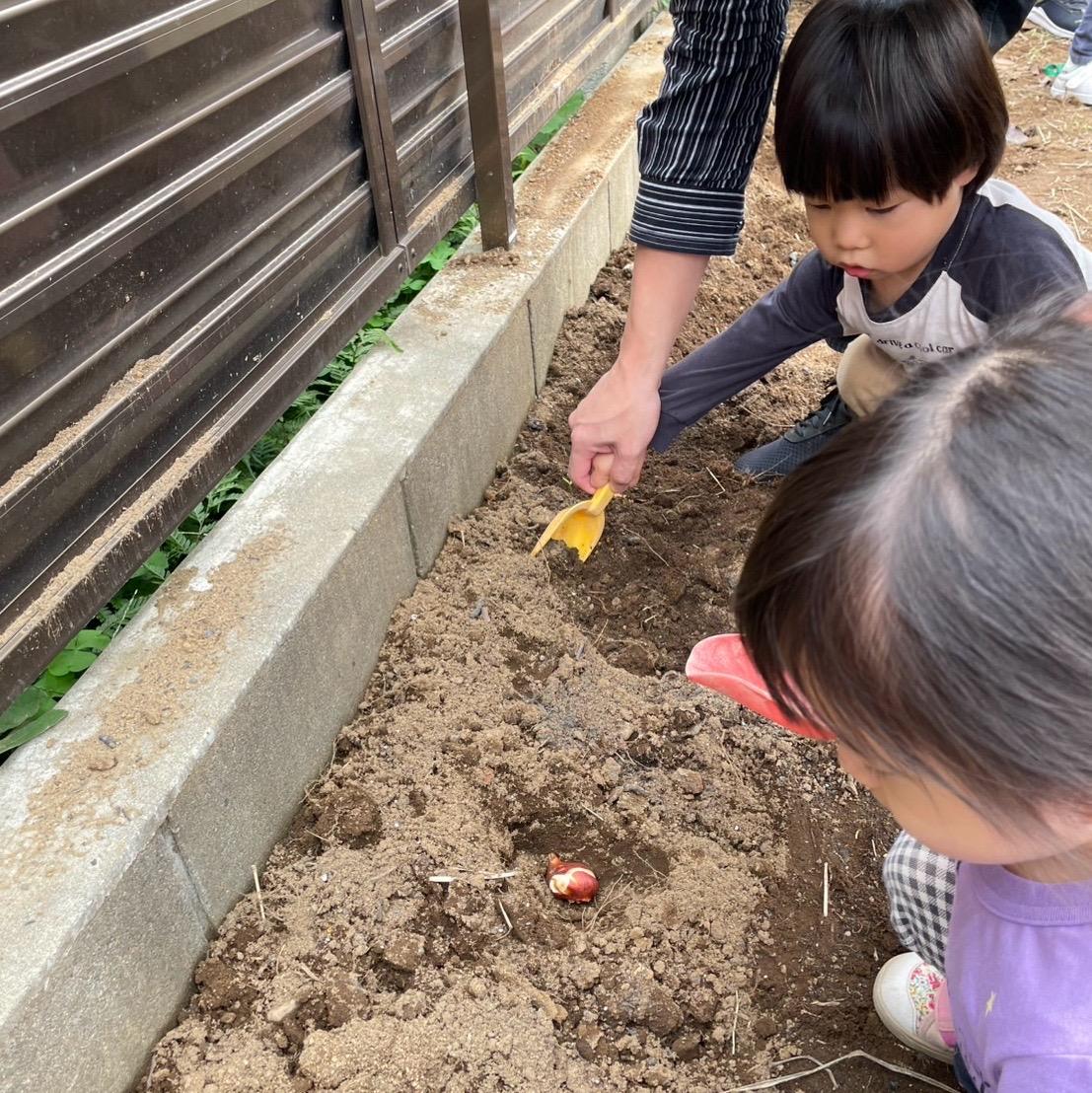 体操の後は、幼稚園の畑にチューリップの球根を植えました🌱