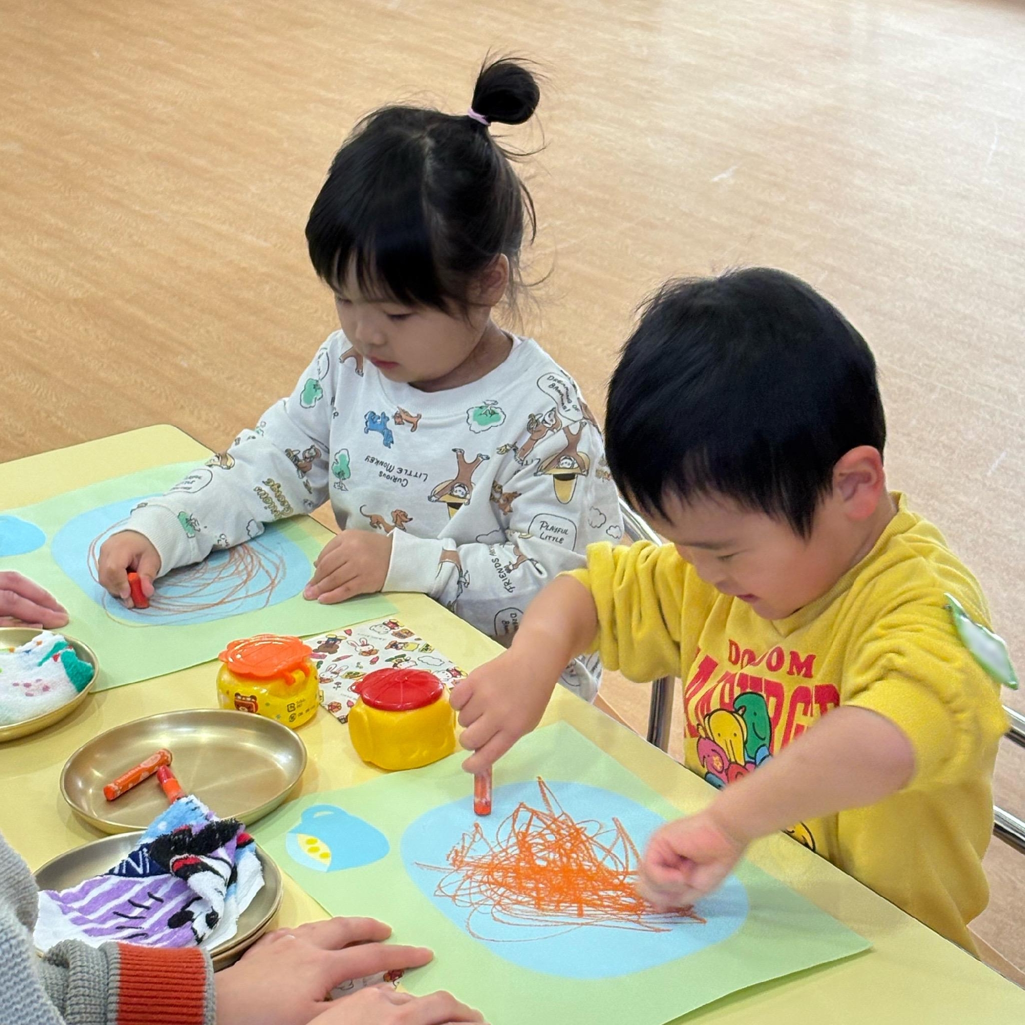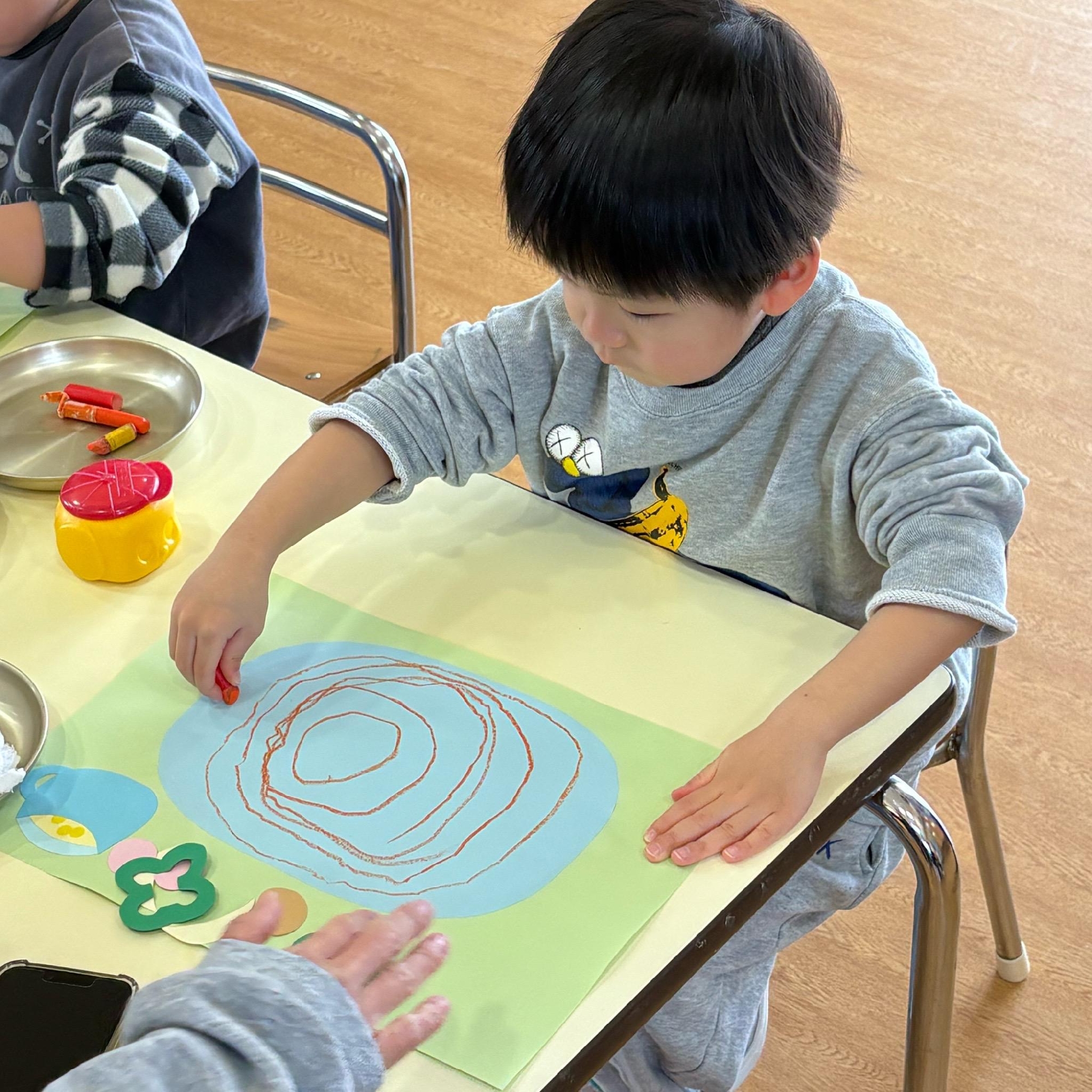 オレンジ色のクレヨンでぐるぐる麺を描き、おいしそうなスパゲッティーができました😋